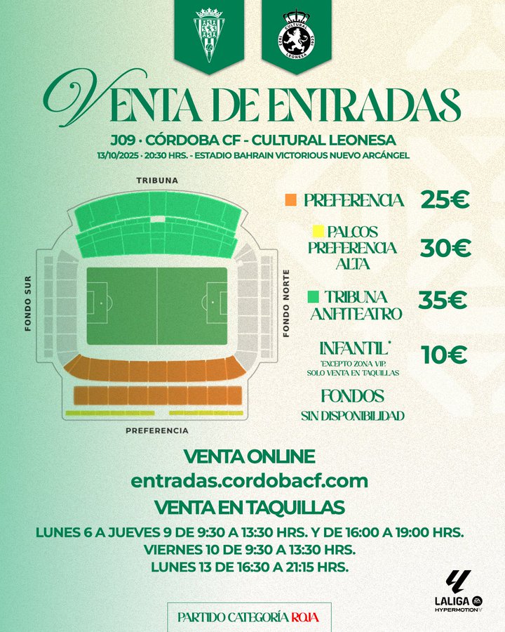 A la espera de conocer las entradas que enviará el equipo cordobés a la Cultural para la grada visitante el Córdoba CF ha habilitado la venta online de las entradas para el partido Cultural – Córdoba con los siguientes precios: